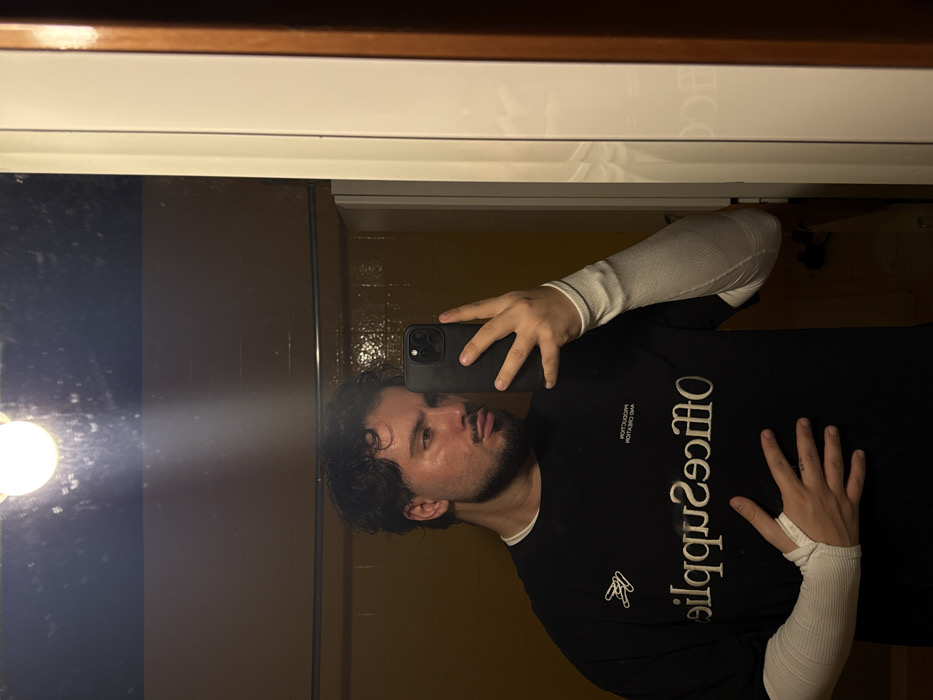 A male individual is depicted in a mirror selfie, standing indoors in Vila Nova de Gaia, Portugal