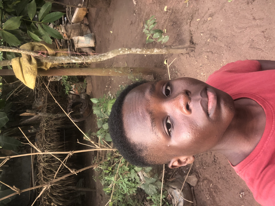 A young man with short, dark hair poses for a selfie outside. He wears a red shirt. His skin is smooth and reflects the light. The background consists of foliage, dirt, and wooden structures. A piece of yellowish cloth hangs from a thin, wooden beam. The ground is earthy, with scattered leaves and small plants. An old metal wheel-like object sits amidst the vegetation. The scene appears to be a rural setting.