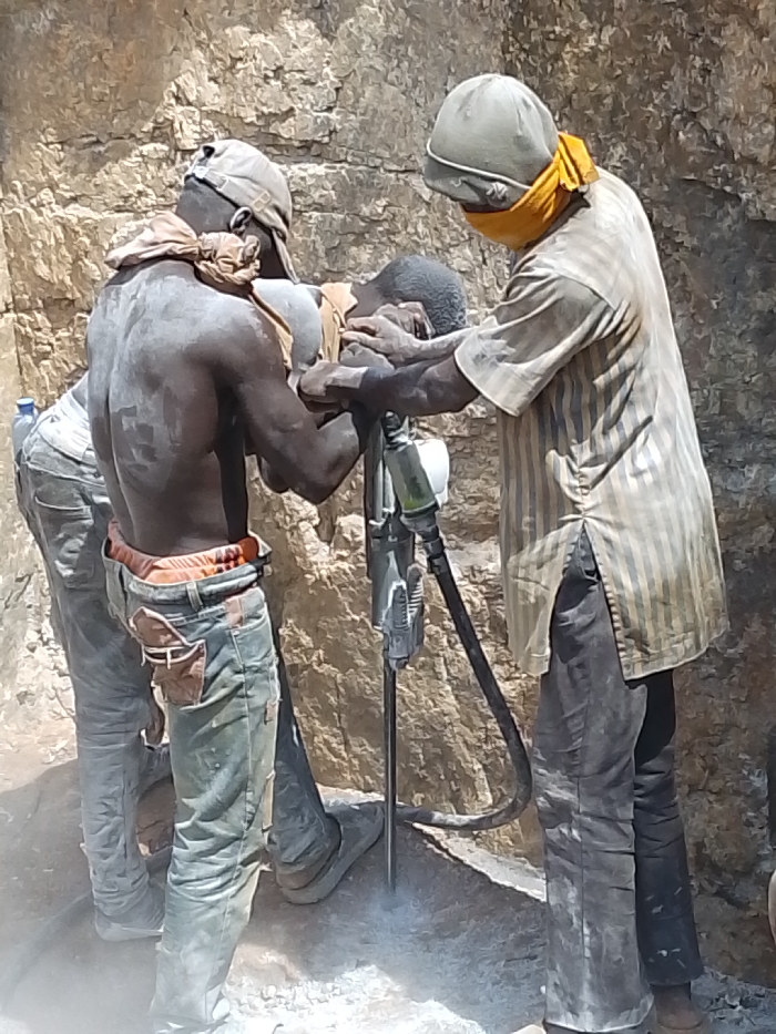 Three men operate a large jackhammer against a rocky cliff face. The shirtless man to the left wears dirty jeans and a cap, back covered in dust. The central figure, also covered in dust, uses both hands to guide the drill. A third man wearing a striped shirt, dust-covered pants, a cap, and a yellow face covering holds the drill steady. All three men appear to be barefoot. Dust and debris surround the base of the jackhammer.