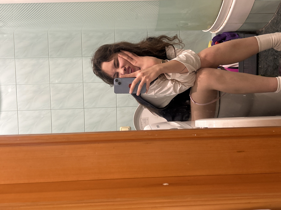 This image depicts a young female reflected in a mirror, situated in a bathroom in Dnipro, Ukraine