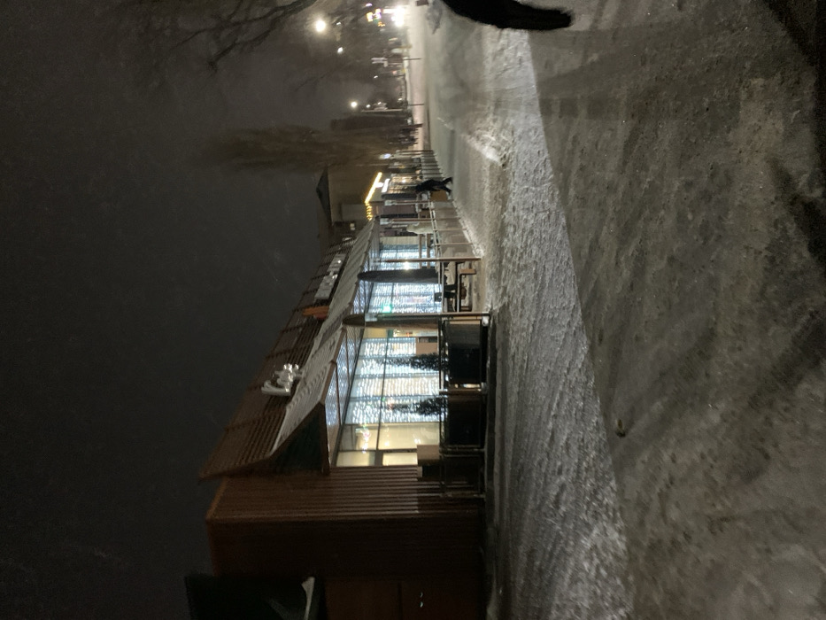 - "A dark, snowy urban scene is dominated by a modern building with large windows displaying bright interior lights" by FM-cZCVx1, licensed under CC BY 4.0