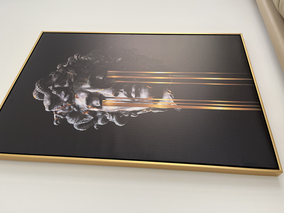 A large, rectangular artwork, oriented vertically, is mounted on a plain white wall. The artwork features a classical-style rendering of the head of Medusa, depicted in shades of dark gray and black, with textures resembling aged stone or bronze. Snakes form her hair, with subtle hints of gold or amber coloring on some scales. From both eye sockets, multiple vertical streaks of bright gold descend, extending downwards across the dark background. The artwork is enclosed within a thin, metallic, gold-colored frame. In the bottom right corner of the image, a light beige or cream-colored upholstered surface, possibly a sofa back or headboard, is partially visible. The photograph is taken at an oblique angle, from the left and slightly below the artwork's center. The scene is located in Sofia, Bulgaria.