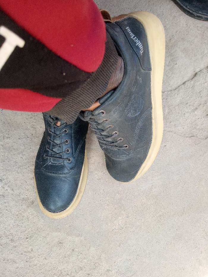 An overhead view captures a person's lower legs and feet on a grey concrete surface in Sabon Tasha, Nigeria. The individual wears a red and black garment, possibly trousers or track pants, featuring a black ribbed cuff at the ankle. Dark socks are visible between the cuff and the footwear. The subject is wearing two dark blue or grey lace-up shoes, likely made of a suede-like material, with distinct light tan or cream-colored soles. The word "Timberland" is visible in white lettering on the outer side of the right shoe, near the ankle. Both shoes display a subtle circular embossed logo, likely the Timberland tree symbol, on their sides. The shoes appear worn and lightly dusted. The concrete ground exhibits minor cracks and texture variations.