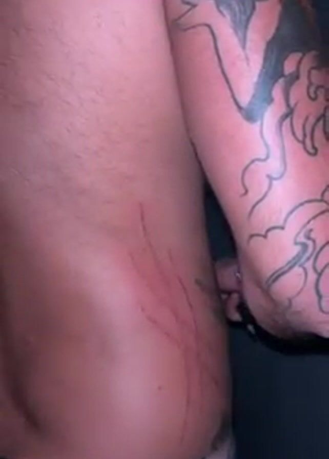 torso and upper left arm of a shirtless person. The person's skin is fair and slightly flushed. On their back, there are several distinct, reddish scratch marks. The left arm bears a tattoo of a woman with flowing hair, surrounded by cloud-like shapes. The person is wearing dark bottoms. The background is a dark, indistinct space.