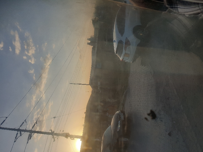A hazy, sunlit view from inside a vehicle. Power lines and telephone poles intersect the sky. In the foreground, parts of a person are visible. A road is seen with parked cars on the right. A car is positioned at the top right corner of the image.