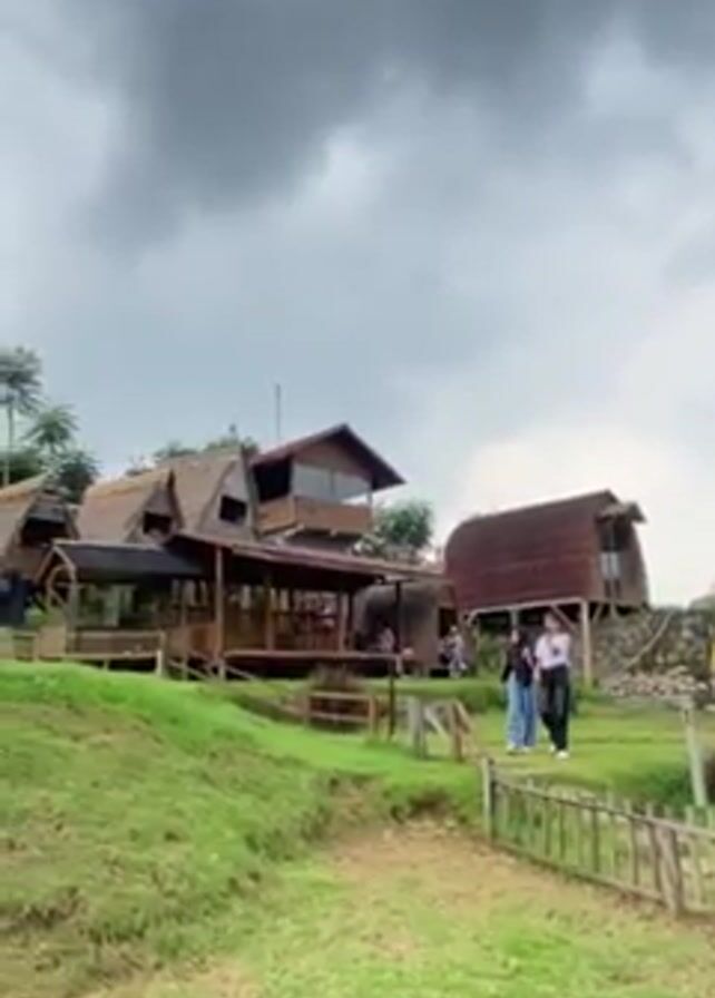 grassy landscape with several wooden structures on a hilltop. The structures are in a rustic style with thatched roofs. Several people are present, some walking on a path and others gathered on the decks of the wooden buildings. The sky is overcast with dark, heavy clouds. A fence is visible along the edge of the grassy area in the foreground. Overall, the scene depicts a rural or countryside setting with a gathering of people at the hilltop structures.