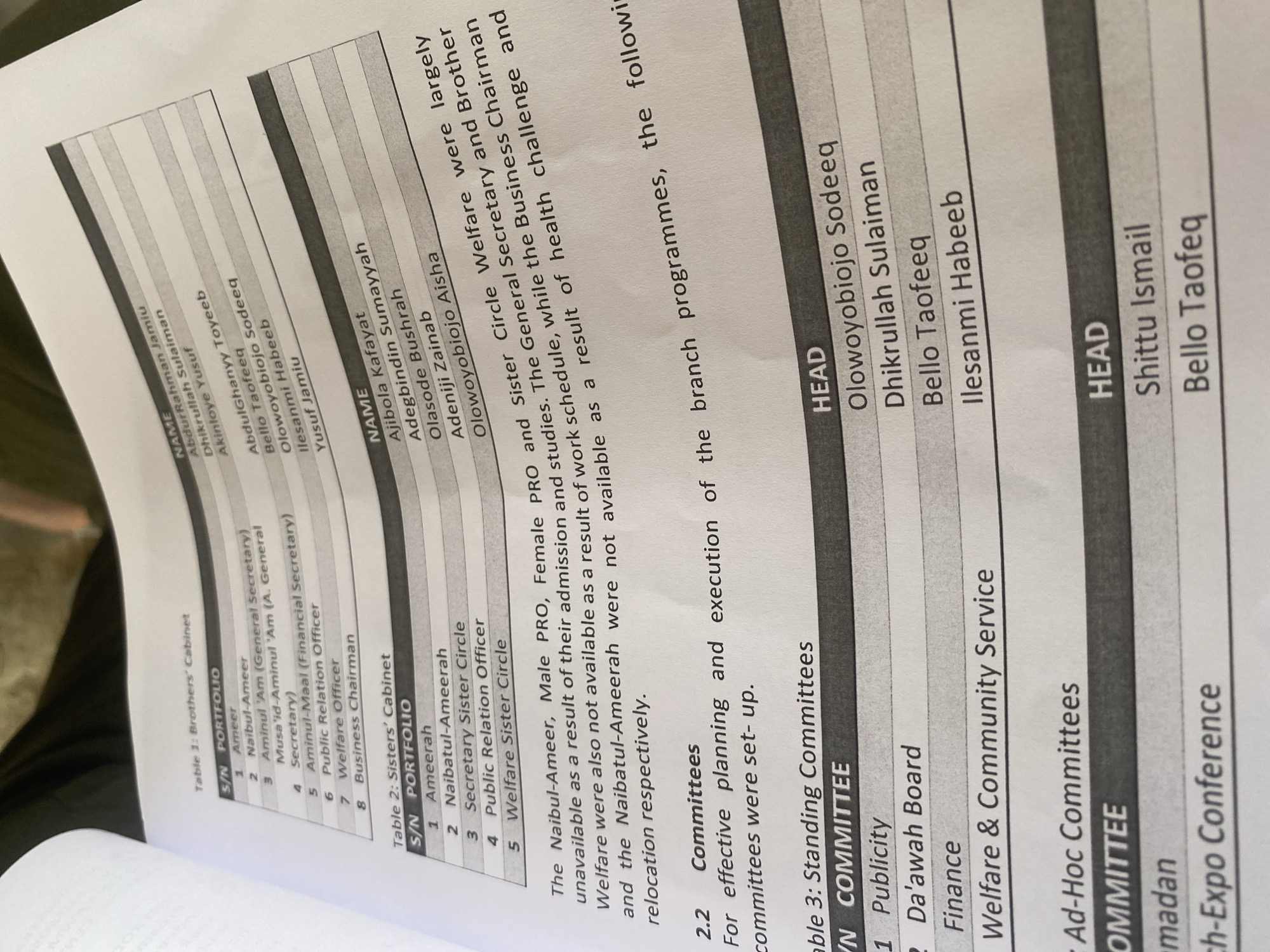 partially visible document titled "Table 1: Brothers' Cabinet" and "Table 2: Sisters' Cabinet". These tables outline the portfolios and names of individuals, possibly in an organization or association. The Brothers' Cabinet lists roles such as Ameer, Naibul-Ameer, and Business Chairman, along with the corresponding names. The Sisters' Cabinet lists roles such as Ameerah, Naibatul-Ameerah, and Welfare Sister Circle, also with corresponding names. The document then transitions into information about committees, stating that they were set up for effective planning and execution of branch programs. "Table 3: Standing Committees" is visible, listing committees such as Publicity, Da'awah Board, Finance, and Welfare & Community Service, along with corresponding HEAD and name. "Ad-Hoc Committees" appear at the bottom, with partially visible committees listed.