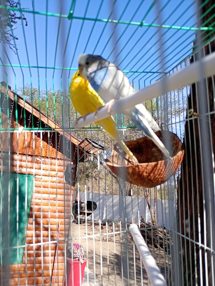 The image captures an outdoor scene in Pozo Almonte, Chile, observed through the light green wire mesh of a bird cage. Two budgerigars are central subjects, perched on a horizontal white plastic rod within the cage. The budgerigar on the left is predominantly yellow, positioned slightly behind and below a second budgerigar, which displays white and light blue plumage. Below and to the right of the birds, a brown, textured feeding or watering dish, resembling a halved coconut shell, hangs from an unseen attachment. Beyond the cage, a clear, bright blue sky occupies the upper portion of the background. To the left, a wooden structure, possibly a cabin or shed, features horizontal log-style siding and a vertical dark green panel. A slender, dark-colored pole leans against this wooden structure. At the base of the structure, a red plastic bucket or container is visible. The ground within the outdoor area is composed of light brown soil or gravel. In the mid-ground, a dark-colored outdoor grill or barbecue unit stands on legs. Further into the background, a white horizontal fence or wall is partially obscured by sparse trees and scattered piles of brushwood on the ground. The scene is illuminated by natural daylight, indicating clear weather conditions.