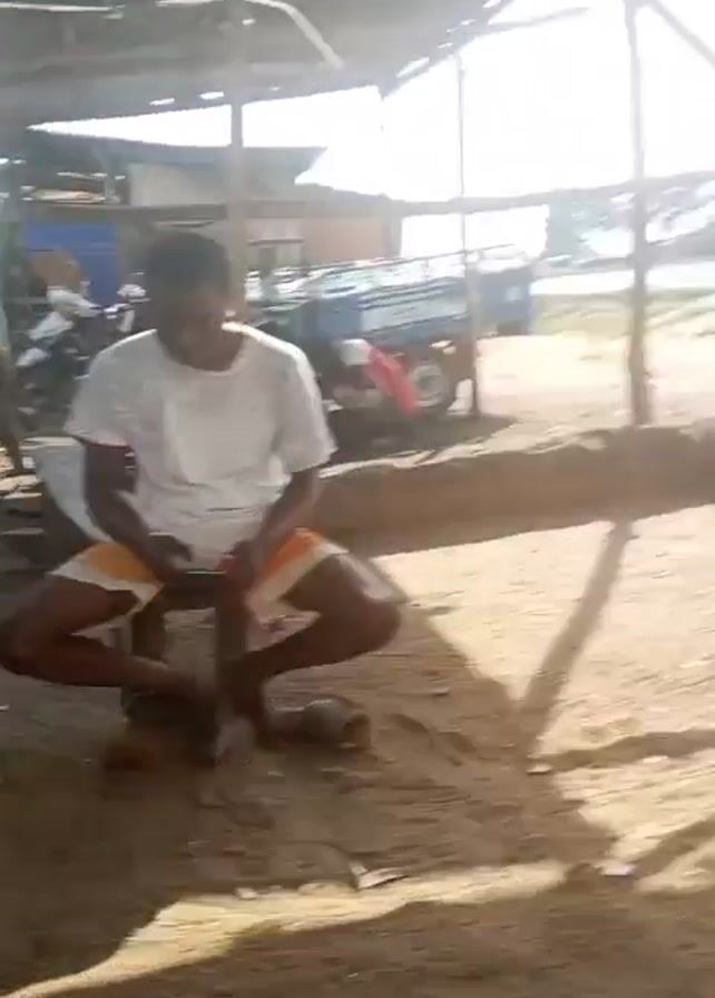 man sitting on a small wooden stool, looking at a mobile phone. He is under the shade of a dilapidated wooden structure. He is wearing a white shirt and orange and white shorts. His sandals are placed on the ground beside him. The area surrounding him is dusty and littered with debris. In the background, across a road, are some buildings and vegetation. A yellow three-wheeled vehicle travels along the road.