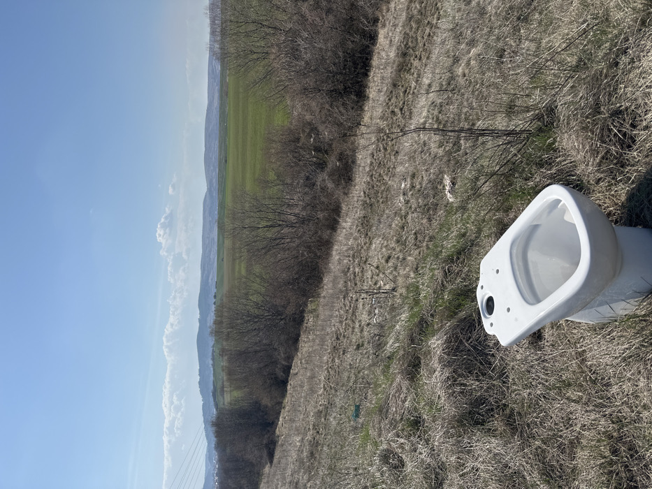 - "A white ceramic toilet bowl, devoid of its tank and seat, rests upright on a dry, unkempt grassy slope at the edge of Cherven Breg, Bulgaria" by FM-ifIs33, licensed under CC BY 4.0