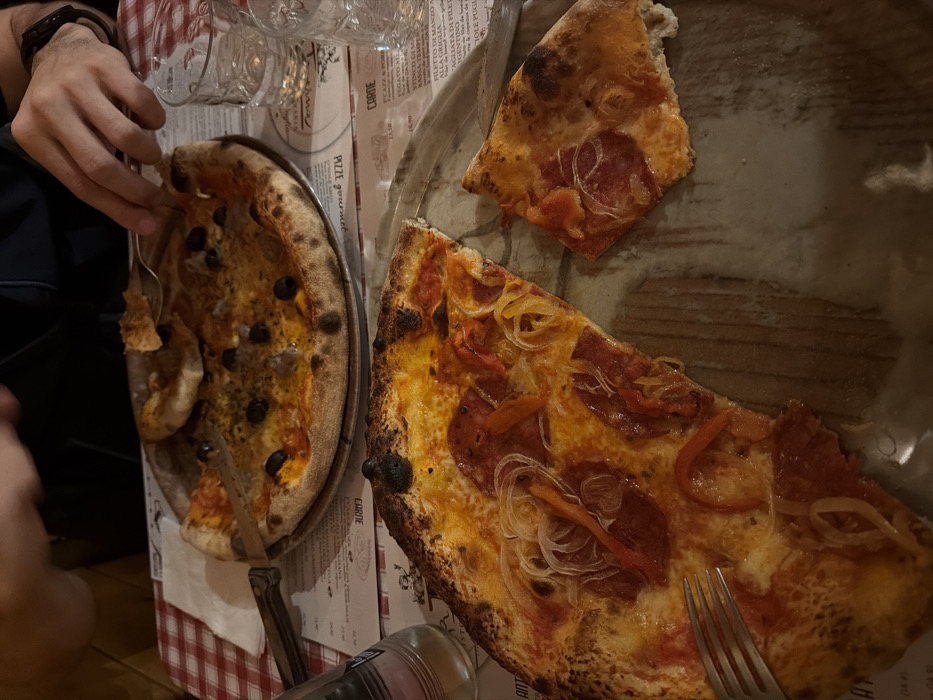 The image depicts a dining table scene in a restaurant in Grevenmacher, Luxembourg. Two partially consumed pizzas are central to the composition. In the foreground, a large, rustic-style plate holds a pizza topped with pepperoni, thinly sliced white onions, and red-orange bell pepper strips. A significant portion of this pizza remains, with one large slice and a smaller detached slice visible. A silver fork is positioned on the larger slice. The pizza's crust displays characteristics of high-temperature baking, including charring. In the mid-ground, a second, round pizza on a metallic-rimmed or lighter-colored plate is also partially eaten. This pizza is topped with black olives and crumbled meat, possibly sausage. A person's hands are visible in the upper right quadrant; the left hand, wearing a dark watch, uses a silver fork to separate a piece from this background pizza. The individual is wearing a dark short-sleeved garment. The table features a red and white checkered tablecloth, overlaid with white paper placemats or menus that display Italian text such as "PIZZE gourmet" and "CARNE." A knife with a wooden handle rests to the left of the background pizza plate. To the right, two clear, textured drinking glasses are present, one appearing to contain liquid. A clear bottle with a white cap is situated on the far left of the table. The background suggests an indoor restaurant setting with wooden paneling visible on the left.