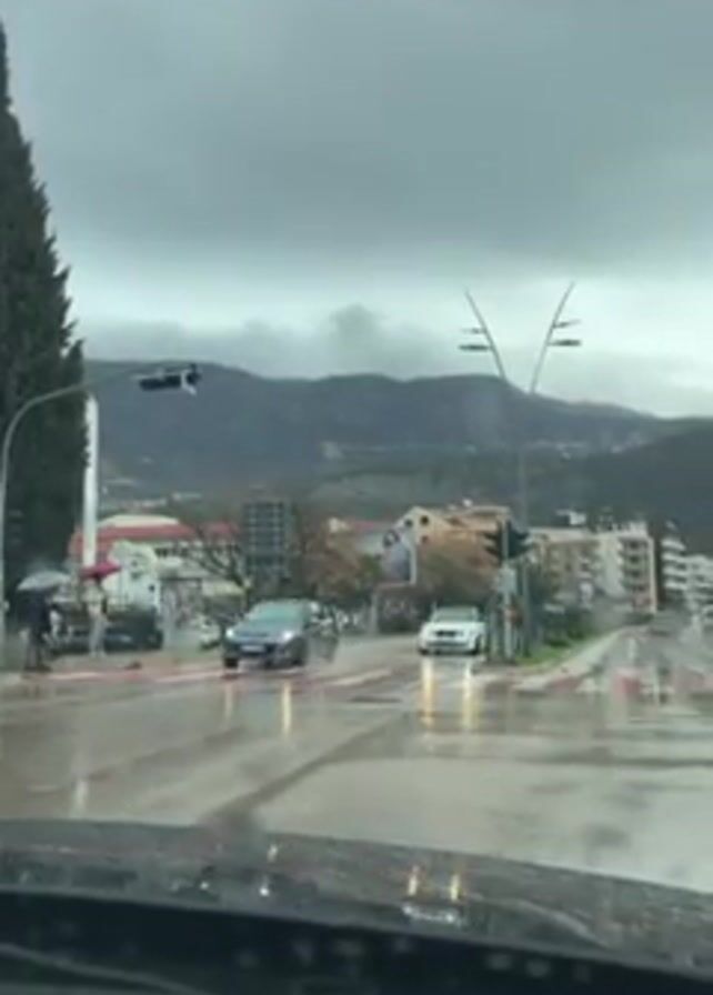The video, shot from inside a car, shows a rainy day in a city with mountainous terrain in the background
