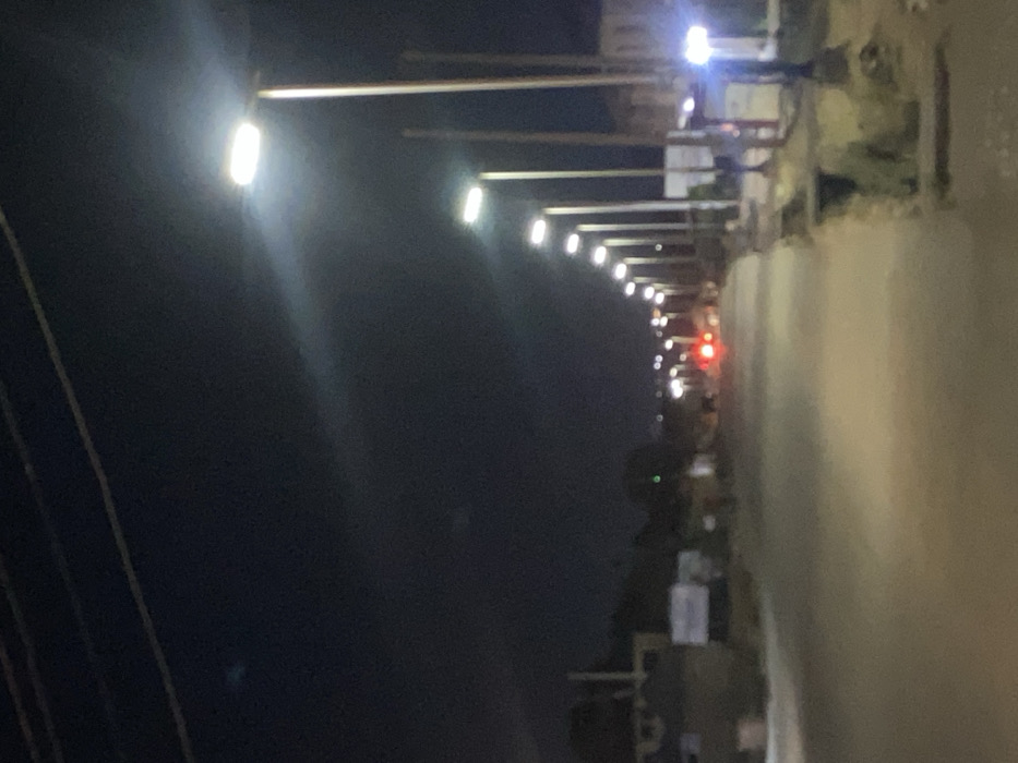 A night scene shows a street lined with evenly spaced lampposts illuminating a dark road. Power lines are visible on the left. Buildings and vegetation line the right side of the road. The photograph appears slightly blurry and is taken at an angle. Red tail lights indicate a vehicle further down the road.