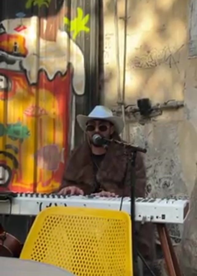 A musician wearing a cowboy hat, sunglasses, and a brown fur coat is playing a keyboard and singing into a microphone outdoors. He sits behind the keyboard, positioned near a yellow mesh chair and a gray table. Behind him is a corrugated metal wall covered with colorful graffiti depicting tropical themes, including palm trees and fish. The setting appears to be an alleyway or outdoor performance space, with sunlight and shadows dappling the surroundings.