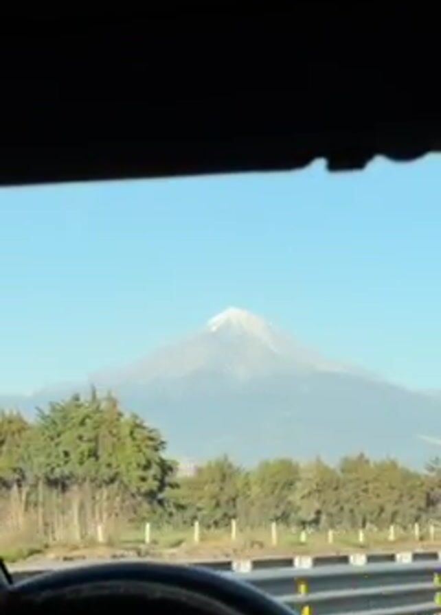 view through the windshield of a car driving on a highway. The steering wheel is visible in the foreground. Outside the car, there is a row of trees along the highway. In the distance, there is a large mountain with a snow-capped peak. The sky is clear and blue.