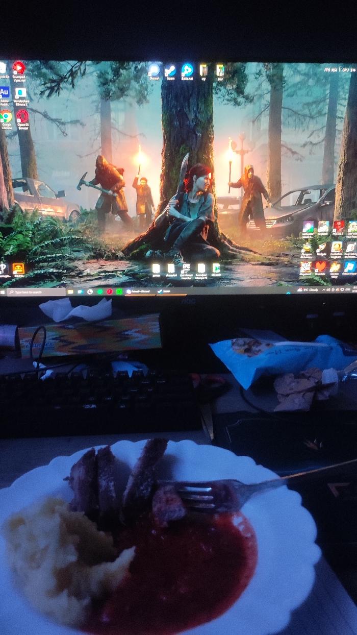 This image captures an indoor scene within the city of Hadzhidimitrovo, Bulgaria, displaying a computer setup and a prepared meal. A black-framed computer monitor dominates the upper portion, exhibiting a desktop background from "The Last of Us Part II," which illustrates a post-apocalyptic forest setting featuring a central female character (Ellie) with a bow, seated against a large tree. Several other figures, some wielding torches or a pickaxe, are visible amidst derelict vehicles and dense foliage. Various desktop icons are arranged on the screen, including Recycle Bin, Discord, Steam, and Chrome. The taskbar at the bottom of the screen shows open applications and a weather display. Below the monitor, a black keyboard rests on a dark desk surface. Behind the keyboard, a patterned box is present, and to the right, a blue foil packet, possibly containing snacks, lies next to crumpled white material. In the immediate foreground, a white plate with a scalloped edge holds a meal composed of a portion of mashed potatoes on the left, several pieces of grilled or fried meat, and a significant amount of red sauce on the right. A silver fork is positioned within the sauce, with one piece of meat impaled on its tines.
