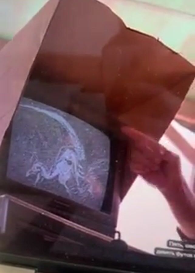 person watching the movie Jurassic Park on a laptop. The laptop is on a wooden desk with a clear blue keyboard cover. The laptop is showing a scene where the characters are looking at a dinosaur skeleton on a small TV monitor covered with a cardboard sunshade. The person watching the movie touches the laptop screen near the TV image.