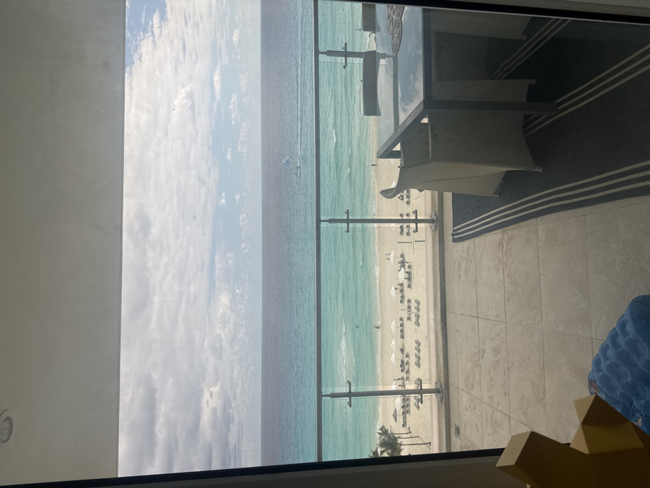 A beachfront view is seen through a window. The ocean spans from left to center, merging into a sandy beach dotted with numerous beach chairs and umbrellas. To the right, the view transitions to a patio area featuring outdoor furniture including chairs and a table atop a striped rug. The leftmost part of the view is the white wall next to the window. The scene is daytime.