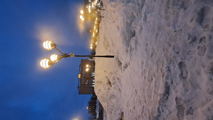 This image depicts an urban winter scene at twilight or night in the city of Меткомелино, Russia. The foreground features snow-covered ground bearing numerous footprints and faint tire tracks. A large, irregular mound of accumulated snow occupies the midground. To the right of this snow pile stands a dark street lamp post with three spherical, illuminated lanterns emitting a warm yellow light. A small white rectangular sign, likely indicating surveillance, is affixed to the lamp post. In the background, a multi-story building with illuminated windows is visible behind the snow, appearing grey-brown under the ambient light. Further right, a sequence of similar streetlights extends into the distance, casting light on a more developed area. The sky above is a deep indigo-blue, contrasting with the artificial illumination. No individuals are present in the frame.