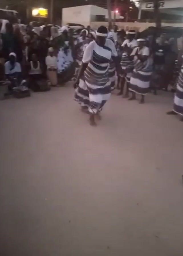 A group of about ten people are dancing in a circle in a dirt or sand covered area. The dancers are dressed in similar outfits consisting of white t-shirts, striped white and dark blue wraps, and white headbands. The dance consists of rhythmic stepping, twisting and arm movements. There are multiple people standing around the outside of the circle watching the dance. A small wicker basket sits on the ground inside the circle. There are buildings and streetlights in the background. The video is somewhat grainy, and shot from a distance. The scene seems to be set outdoors at dusk or night.