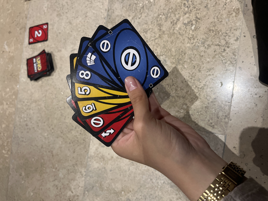 - "This image depicts a close-up, overhead view of a game of Uno in progress on a light-colored tiled floor, located in Tlaxcalancingo, Mexico" by FM-0LhgI3, licensed under CC BY 4.0