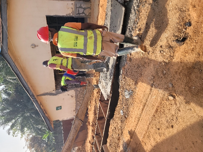 The scene depicts an outdoor construction site in Akwanga, Nigeria