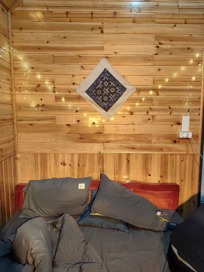 This image depicts the interior of a room in Tả Van, Vietnam, characterized by light-toned wooden plank walls. The upper portion of the wall features horizontally laid planks, while the lower section uses vertically oriented panels. A string of warm white fairy lights is draped diagonally across the upper wall. Centrally mounted on the upper wall is a diamond-oriented square textile artwork with intricate geometric patterns in dark blue, green, and brown on a light background. To the right, a white wall-mounted power outlet has a white multi-port charger plugged into it, with a visible white cable extending downwards. The lower half of the image is dominated by a bed with a reddish-brown wooden headboard. The bed is furnished with disheveled dark grey pillows and a matching duvet. A smaller, blue textured pillow is partially visible beneath one of the main pillows. On the right side of the bed, near the headboard, a blue object partially displaying "JBL" lettering is present, along with a yellow cable and a white charging connector. There are no people visible, and no actions or interactions are occurring.