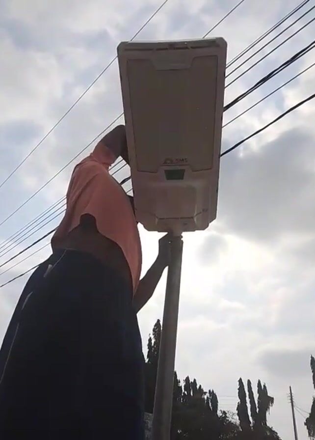 A person in a coral shirt and black pants stands facing a streetlight, attaching it to a metal pole. They are using both hands to secure the light fixture, which has a white rectangular housing. Above them are overhead power lines against a cloudy sky. Some trees are visible in the background, on a slight rise.