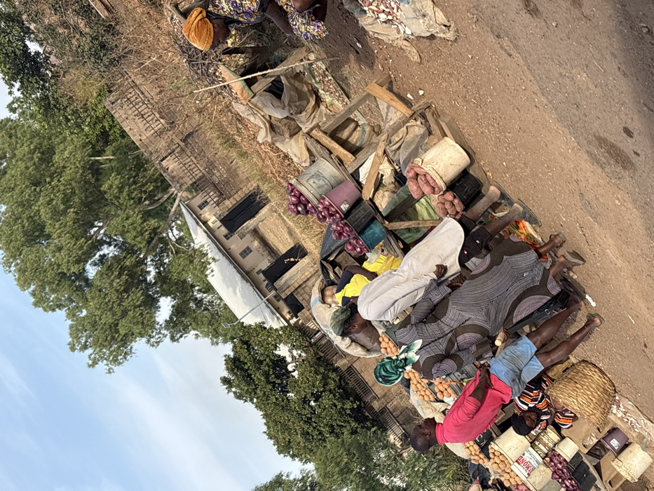 The image displays an outdoor market scene in Riyom, Nigeria