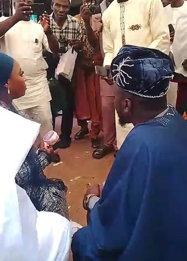 The video captures a gathering of individuals dressed in formal attire, likely at a special event such as a wedding. A group of people are taking pictures and videos with their phones, surrounding a seated man and woman. The woman is holding a small fan. The ground appears to be dirt or sand.
