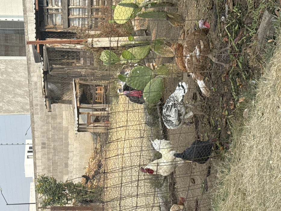 The image displays an outdoor scene in Sanctorum, Mexico, featuring a rustic animal enclosure set against an urban backdrop. The foreground consists of dry grass leading to a wire mesh fence that runs horizontally across the lower and middle portions of the frame. Inside the fence, the ground is dark soil mixed with organic debris. Several domestic fowl are present: * A white rooster with a prominent red comb and wattle stands on the left. * A black chicken is partially visible below the rooster, foraging on the ground. * A turkey with mottled white and black plumage is visible in the center, pecking at the ground. * A reddish-brown turkey is positioned on the right, also engaged in foraging. * A dark-plumaged turkey with a visible reddish head is partially obscured by vegetation in the mid-right. A cluster of green, paddle-shaped prickly pear cacti grows vertically within the enclosure, primarily on the right side. Behind the animals and cacti, two makeshift wooden structures with corrugated metal roofs are visible, serving as animal shelters. The larger structure on the right is partially enclosed by wire mesh and contains a wooden crate. To the left of these structures, a pile of dried organic material is present. The background is dominated by a long wall constructed of light-colored concrete blocks. Above this wall, modern multi-story buildings with flat roofs and light facades are visible under a clear sky, accompanied by utility poles or streetlights, indicating a developed urban environment. No human individuals are visible.