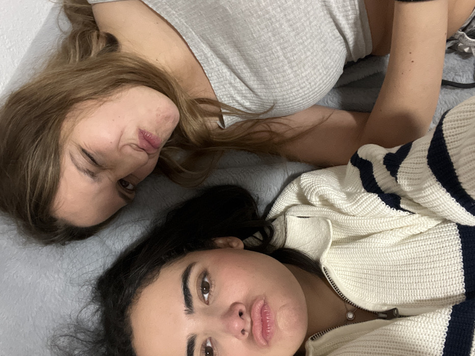 - "This image depicts an indoor scene in the city of Valencia, Spain, featuring two young adult females positioned closely together on a light gray, soft surface, likely a bed or couch, from an overhead perspective" by FM-IX6tF2, licensed under CC BY 4.0