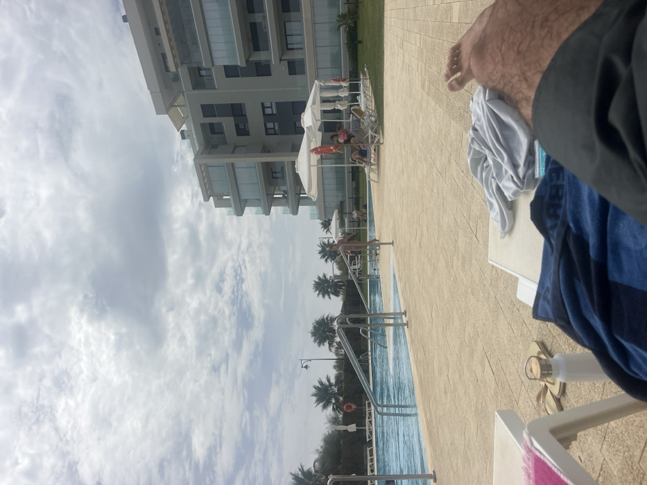 The image depicts a daytime scene at a swimming pool area in Ayamonte, Spain, under an overcast sky. In the immediate foreground, the viewer's lower legs and feet are visible, covered partially by a black garment. A blue and black striped towel lies on a light-colored lounge chair, next to which a white water bottle and light-colored flip-flops are positioned. Another grey towel is on a second lounge chair to the right. The midground features a large, rectangular swimming pool with light blue water, accessible by multiple stainless steel handrails. The pool is surrounded by a light-colored tiled deck. Beyond the pool, a young child in a light-colored swimsuit stands on the deck. Further back, on a patch of green grass, several white sun loungers are arranged under two white sun umbrellas. Multiple individuals, including adults and children, are seated or reclining on these loungers. A red lifebuoy is attached to a pole near one of the umbrellas. In the background, a modern, multi-story building with a light-colored facade and numerous glass balconies dominates the right side of the frame. Palm trees are visible along the distant horizon, particularly on the left side, behind a low fence or hedge. The sky is largely covered with patchy white and grey clouds.
