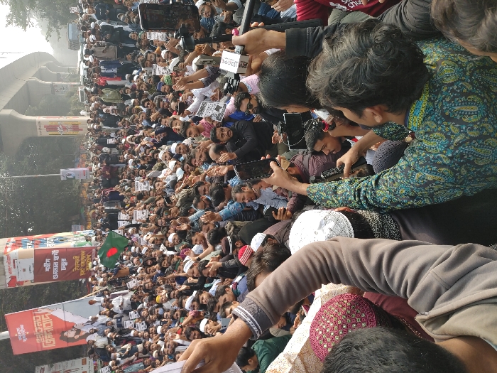 A wide-angle, slightly elevated view captures a large public gathering or demonstration on a broad road in Dhaka, Bangladesh