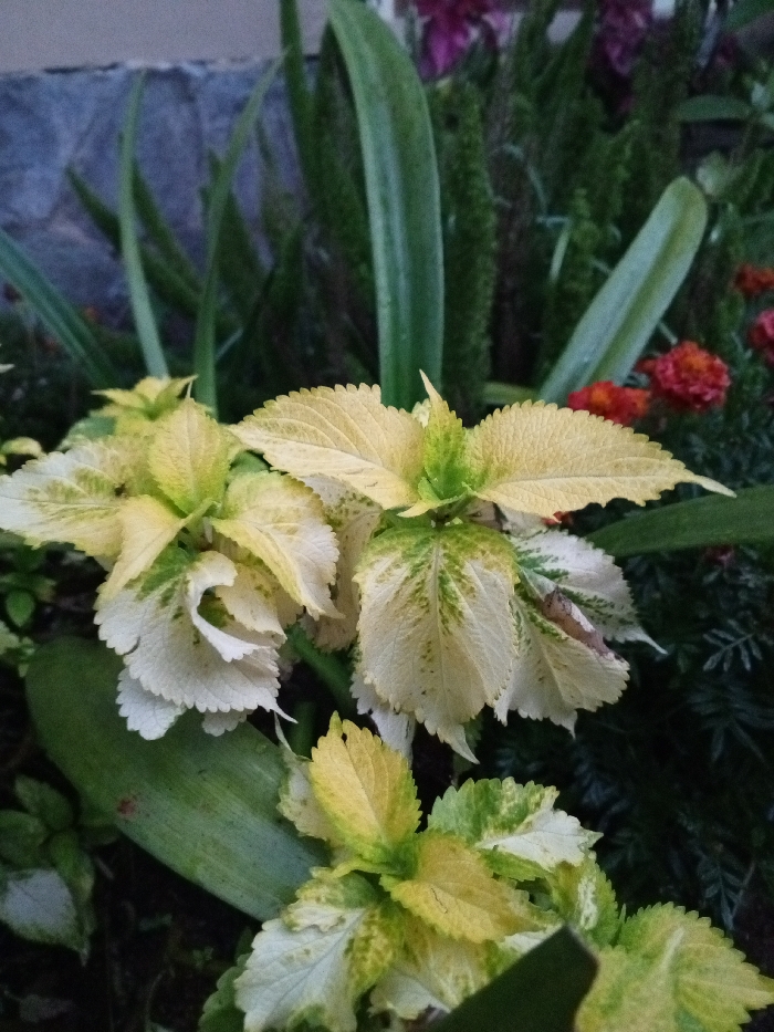 This image depicts a close-up of variegated Coleus plants in an outdoor garden in Catarman, Philippines. The foreground is dominated by several clusters of Coleus with leaves exhibiting a mottled pattern of pale yellow, cream, and light green, featuring distinct serrated edges. In the midground, various other green plants are visible, including long, upright strap-like leaves and darker, denser foliage, along with small clusters of orange-red flowers on the right side. The background consists of a blurred, dark gray concrete wall or structure on the upper left. No people, discernible objects other than plants, actions, or interactions are present.