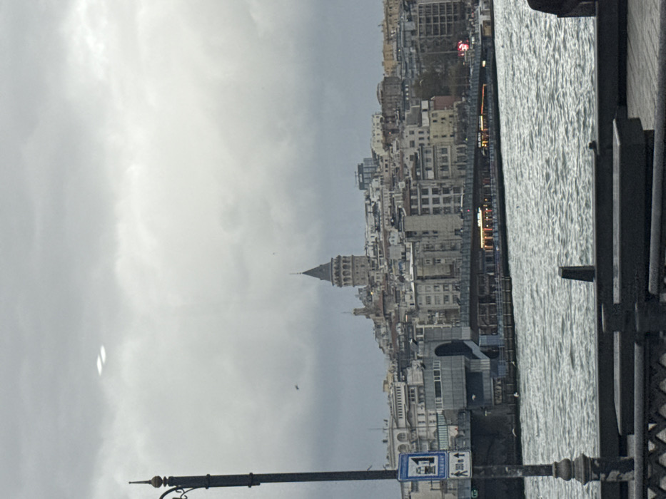 The Galata Tower dominates the skyline in Istanbul, Turkey, under a cloudy sky. The city's buildings stretch to the right, bordered by a body of water with visible waves. A lamppost and blue sign are in the foreground on the lower left. The edge of a walkway or ship is on the right side of the frame, with metal rails partially visible.