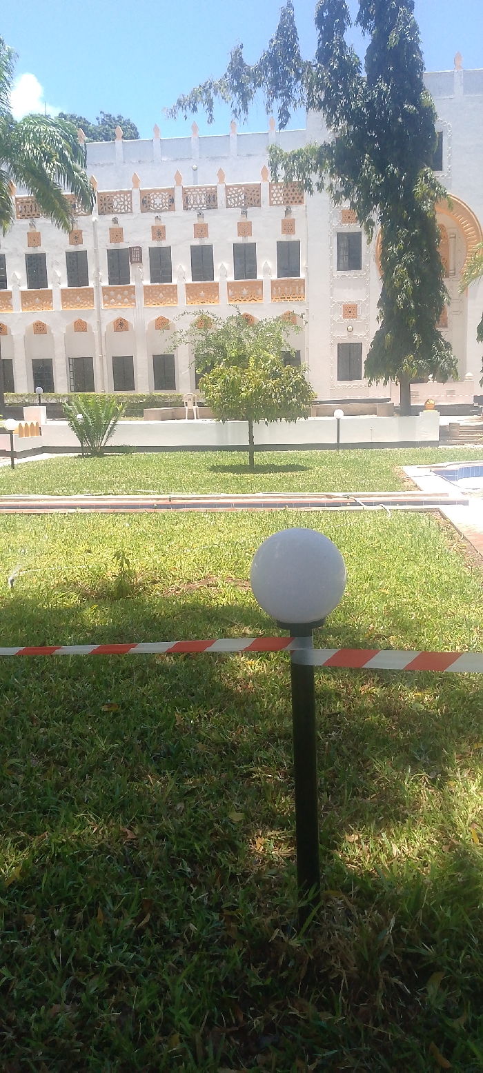 The image depicts an outdoor scene in Tudor ward, Kenya, dominated by a large, white building with intricate architectural details in the background. In the foreground, green grass is present, partially shaded. A black pole with a white spherical light fixture stands slightly right of center, from which a red and white striped barrier tape extends horizontally to the left. The midground features a manicured lawn area with a small tree bearing green foliage, and a smaller spiky-leaved plant in a raised planter to the left. A light-colored plastic chair is visible on an elevated platform behind the small tree, and additional spherical lights are positioned along the raised borders. To the far right, a narrow section of blue-tiled water is visible, possibly part of a fountain or pool. The background building is multi-storied, primarily white with numerous light orange or terracotta decorative elements, including ornate balustrades, window surrounds, and a crenelated roofline. Dark rectangular windows are visible across its facade. Tall, slender trees with dense green foliage flank the building, with a palm tree visible on the far left. The sky above is clear and bright blue. No people, active movements, or direct interactions are visible within the frame.