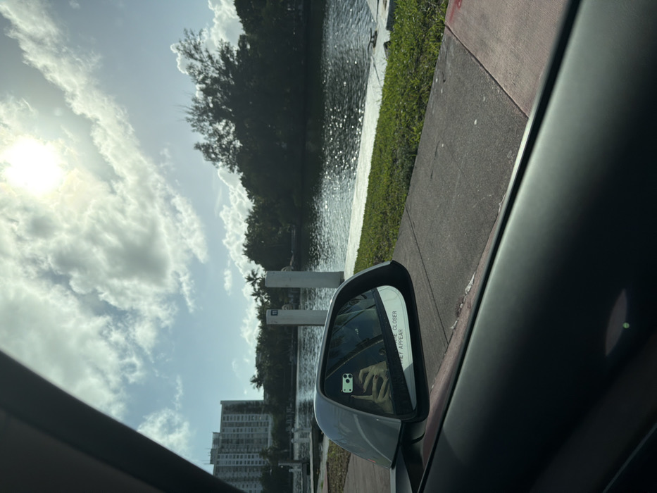 The image depicts a bright daytime scene from the interior of a vehicle, looking outwards across a waterway identified as part of the canal system in Miami Beach, United States. In the foreground, the dark-colored upper door panel and window frame of the vehicle are visible. A gray side mirror is positioned in the lower-left quadrant, bearing the inscription "OBJECTS IN MIRROR ARE CLOSER THAN THEY APPEAR." The mirror reflects the hand and lower forearm of an individual, likely the photographer, holding a light-green cased smartphone with a visible triple-lens camera array. The individual's fingernails are painted dark. Beyond the vehicle, a concrete sidewalk or pathway runs parallel to a narrow strip of green grass. This grass borders a concrete seawall or dock that edges a body of water, characterized by sunlit ripples across its surface. In the mid-ground, two white vertical pilings or markers stand at the water's edge. The far bank of the waterway is covered with dense, dark green tropical foliage, including prominent palm trees. To the left, a tall, light-colored multi-story building, consistent with residential or hotel architecture, rises above the tree line. The sky overhead is light blue with scattered white cumulus clouds, and a bright, intense sun is visible in the upper right portion of the frame.