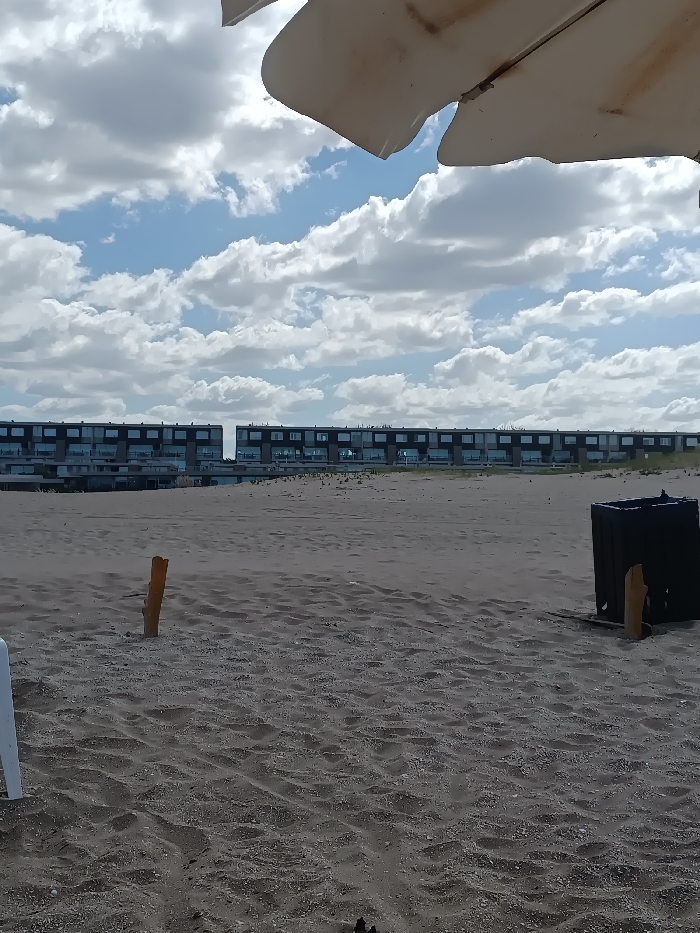 The image displays a static beach scene in Mar de las Pampas, Argentina, under a partially cloudy sky. The upper portion of a dirty white beach umbrella or awning is visible in the top section of the frame, partially obscuring the sky which features numerous white cumulus clouds against a blue background. The lower left corner of the foreground shows the partial white armrest of a plastic chair. The expansive mid-ground consists of light brown sand with visible ripples and textures. Embedded in the sand on the left is a single, weathered wooden post. To the right, a dark, rectangular, open-top waste bin stands in the sand, with a piece of wood leaning against its side. Stretching across the horizon in the background is a long, multi-story building complex, characterized by dark facades, numerous windows, and balconies. This structure appears as two distinct segments separated by a gap. No individuals or active subjects are present in the scene.