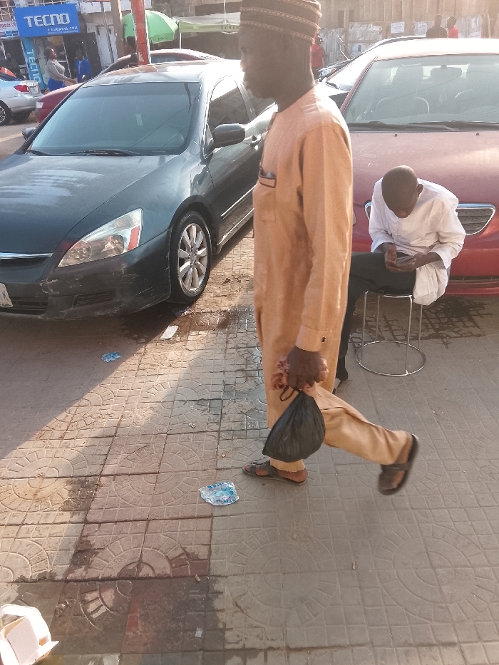 A man in tan clothing and a woven cap walks right, holding a black plastic bag. He wears sandals. Behind him, another man in a white shirt sits on a metal stool, focused on a cell phone. Two cars are parked nearby: a dark gray sedan on the left and a red sedan on the right. The scene takes place on a patterned tiled sidewalk with some trash scattered on it, with a storefront visible in the background.