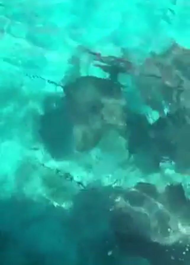 The camera is looking down into very clear, turquoise water
