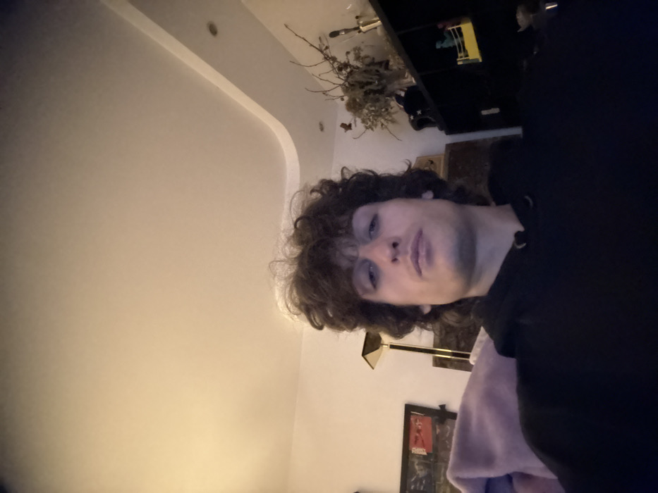 A man with curly brown hair is centered in the frame, wearing a black hoodie. The background includes a white wall, ceiling molding, a floor lamp, and a framed picture. A black entertainment center and a decorative arrangement of branches are visible in the upper right corner. The image is slightly tilted.