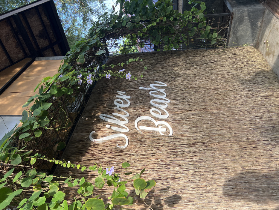 The image displays an exterior wall of a structure located in Baan Chaweng Noi, Thailand. The wall is constructed from vertically oriented dried thatch material, exhibiting a light brown, fibrous texture. Affixed to the central portion of this thatch wall are white, stylized script letters that spell "Silver Beach". Green climbing vines with broad leaves and numerous light purple, bell-shaped flowers are draped over the upper edge of the thatch wall and extend across a dark metal trellis visible to the right. Above the thatch wall, a section of a light brown building facade and a dark-framed roof overhang are present. At the base of the wall on the right, a grey concrete planter or low wall structure is situated on a grey concrete ground surface, where small pieces of white and yellow floral debris are scattered. The scene is illuminated by direct sunlight originating from the left, casting distinct shadows of the foliage onto the thatch wall. A discernible shadow, consistent with the upper body of a person, is projected onto the lower-left area of the thatch wall. The upper-right background reveals a segment of clear blue sky and additional green tree foliage.