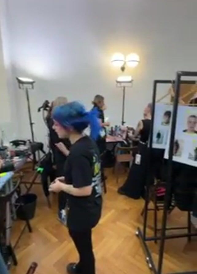 bustling backstage area likely preparing for a fashion shoot or show. There are several individuals, mostly adults, in the room. Two women are in conversation near a makeup station. A person with blue hair and colorful makeup stands nearby. Other people are seated or standing around other stations or clothing racks. Some people are working on hair and makeup, and one person is reclined on a chair, seemingly resting. Clothing racks are filled with various garments. The room has wooden parquet flooring, white walls, and overhead lighting. Photos of models are visible on a rack. The atmosphere appears busy and pre-event.