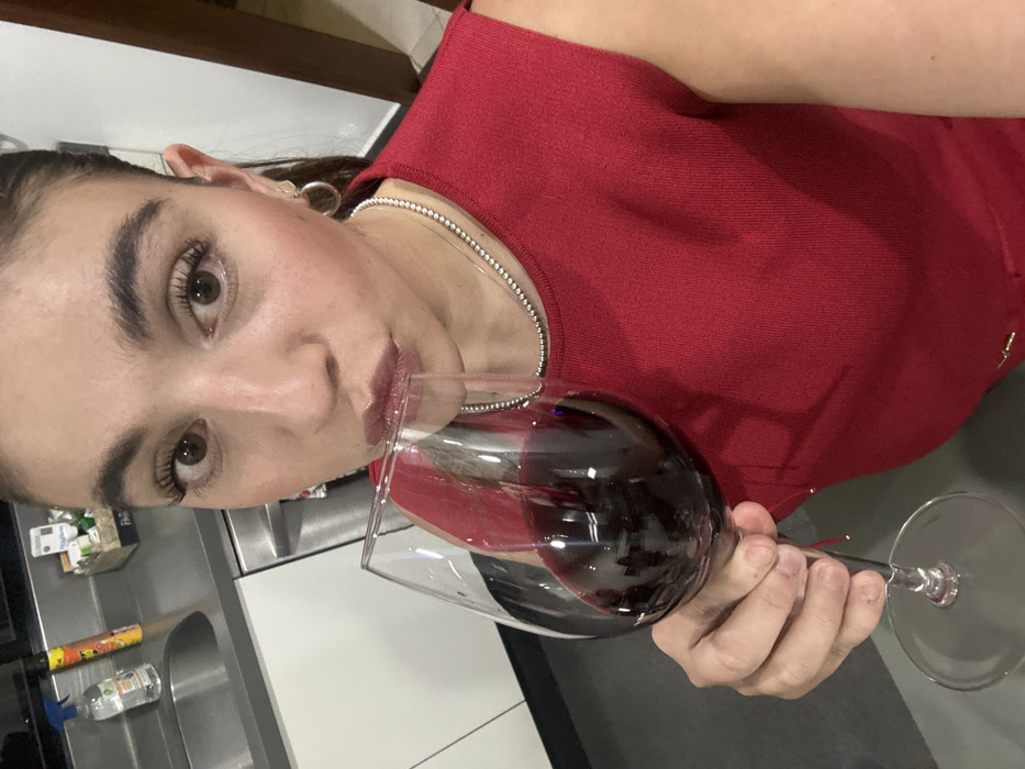 A woman with brown eyes and dark hair pulled back is holding a large glass of red wine. She wears a red, sleeveless top and a silver chain necklace. Her lips are touching the rim of the glass, as if she's about to take a sip. The background shows a kitchen counter with various items, including cleaning products and a bottle of water. The picture is taken at a tilted angle, emphasizing the glass of wine and the woman's face.
