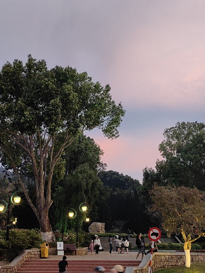 This image depicts a public park or square at Lam Vien Square (Quảng trường Lâm Viên) in Da Lat, Vietnam, during dusk or early evening. The sky displays a gradient of light pink, pale blue, and gray. In the foreground, a wide, multi-tiered staircase with reddish-brown steps descends towards the viewer. Two individuals are present on the lower steps; one is seated on the left, wearing dark clothing, and another is partially visible on the far right, blurred. A low stone wall with red and white barriers runs along the right side of the staircase. The midground features a paved area beyond the steps. A large, mature tree with a thick trunk and dense green foliage stands prominently on the left, next to the staircase. Several modern streetlights with illuminated yellow-green crescent-shaped fixtures are positioned throughout the scene. A yellow public waste bin and a white rectangular bench are located near the base of the large tree. Approximately 10-15 people are scattered across the paved area, standing in small groups or walking. One woman in a white jacket is holding a small child's hand. Other individuals are casually dressed, some interacting. In the mid-background, partially obscured by trees and people, a large stone sculpture of a historical figure (Tran Hung Dao) is visible. To the right of the paved area, a circular red and white "no vehicles" sign is mounted on a post. The background consists of dense green foliage and numerous trees, suggesting a park or forested hill. Artificial lighting from the streetlights is active, contrasting with the fading natural light.