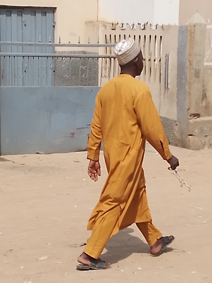 A male subject is depicted in an outdoor urban environment within Gwagwarwa, Nigeria. The subject, viewed from the rear and slightly to the right, is in mid-stride, walking towards the right side of the frame. He wears a mustard yellow, long-sleeved tunic over matching trousers and dark-colored slip-on sandals. A light-colored, intricately patterned skullcap is worn on his head. In his right hand, he holds a cluster of several thin, light-colored twigs or sticks. The ground surface is light brown, appearing sandy or dusty, with minimal debris. In the background, a light-colored building wall is visible. A grey metal gate, featuring horizontal and decorative elements, is positioned behind and to the left of the subject. Further right, a partial view of concrete steps or a raised platform is present against the background wall. The scene is illuminated by natural daylight.