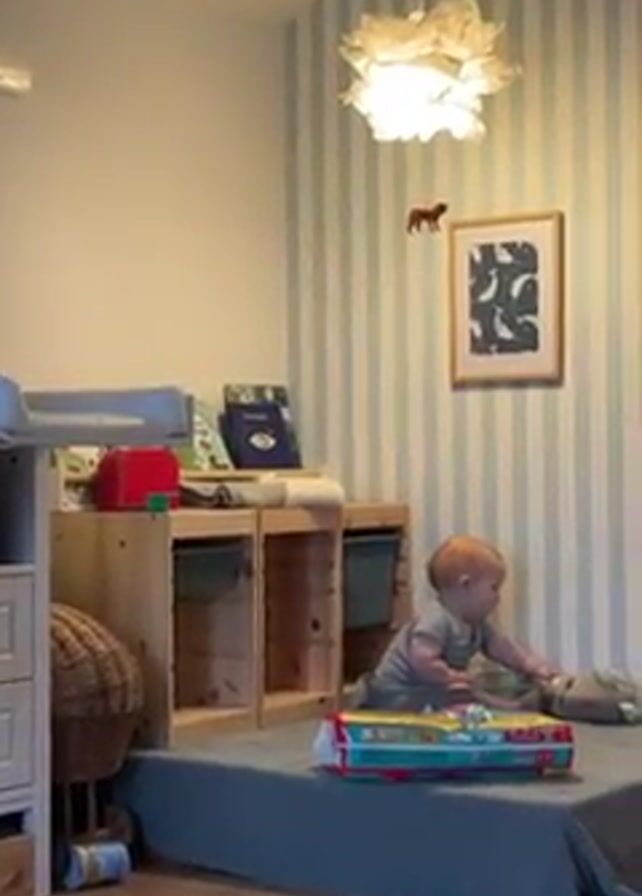 A baby with red hair is sitting on a blue mat in a child’s room