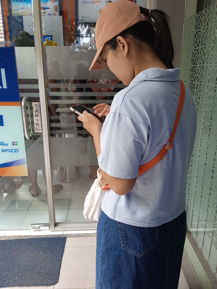 A person is depicted from behind, standing outdoors near a glass-fronted entrance in Sarimulyo, Indonesia