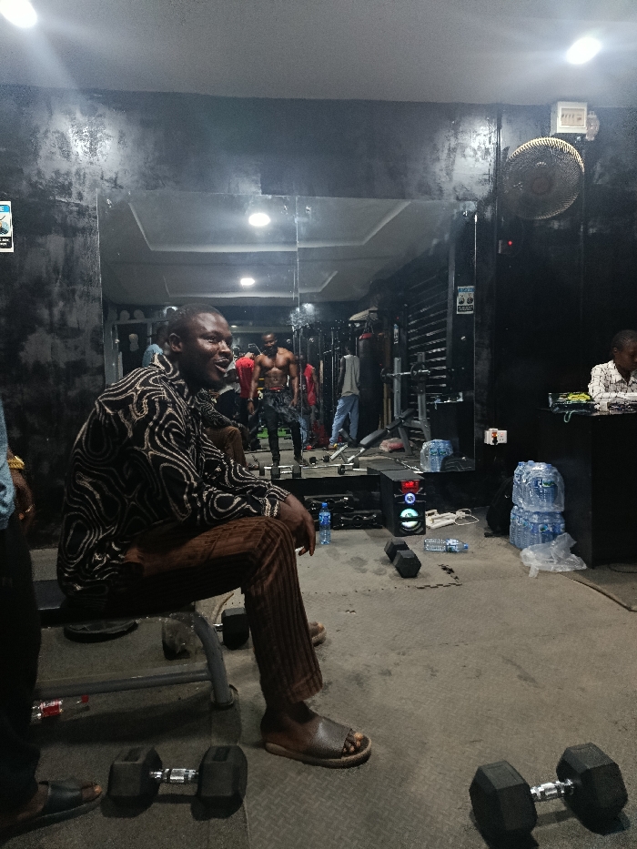 The image depicts the interior of a gymnasium in Kabong, Nigeria. In the foreground, a male individual of African descent is seated on a grey padded weight bench, looking to the right with a slight smile and open mouth. He wears a long-sleeved black and brown patterned shirt, brown trousers, and open-toed brown sandals. To his immediate left, a partial view of another person in dark attire is visible. Two black hexagonal dumbbells rest on the grey rubber mat flooring, one to the left of the bench and another to the right. The background features a wall covered with large mirrors, reflecting various gym activities and equipment. Reflected in the mirror, a shirtless, muscular man is prominently visible, standing near a weight rack. Other individuals are also seen in the reflections, some exercising or standing near equipment like a punching bag and additional weight machines. To the right of the primary subject, a black portable speaker with multi-colored flashing lights sits on the floor. Stacks of bundled bottled and sachet water are positioned against a dark counter or wall further right. A male individual in a plaid shirt is seated behind a dark desk on the far right, facing the desk. A white wall-mounted fan and an electrical box are affixed to the wall above the desk area. The gym's ceiling is dark with multiple artificial light fixtures, some of which are reflected in the mirrors. The walls above the mirrors are dark grey with a textured finish.